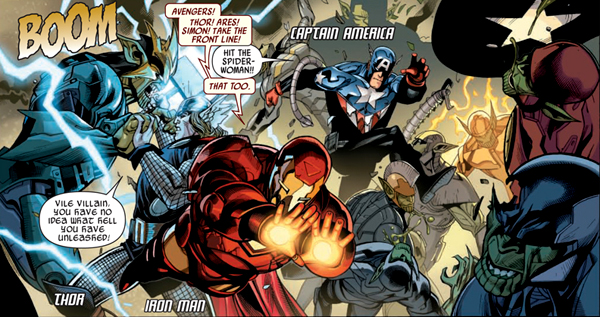 En medio de toda la acción, Bendis aún reserva instantes para el lucimiento individual –Ojo de Halcón, el Pym-skrull, Luke Cage- y para giros de tuerca. Esperados (la escena final con la Avispa) o no (Jessica Jones y su bebe), con dichos retruécanos el guionista echa más leña al fuego ante la batalla contra un enemigo que, pese a estar tocado, no está dispuesto a hundirse solo. Cierto que varios detalles parecen poco trabajados-la aparición de Marvel Boy, la salida de escena de Iron Man- pero la intensidad de la batalla está más que lograda. Lo suficiente al menos para esperar con impaciencia el siguiente y último número.