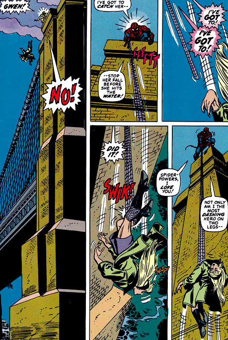 La dulce y cándida novia de Peter Parker sufrió un sobrecogedor destino final después de ser secuestrada por el Duende Verde. Spider-Man no pudo salvarla de la mortal caída desde el Puente de Brooklyn, lo que redundó en un aumentó todavía mayor de la culpa e impotencia almacenadas por Peter.