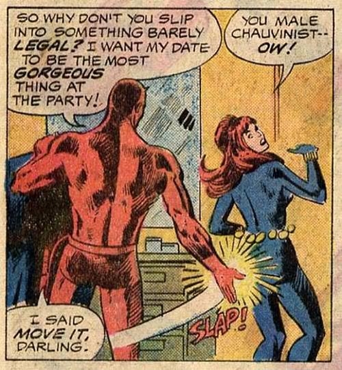 Esto chocaba con la visión previa que veníamos conociendo desde su creación a cargo de Stan Lee y Bill Everett. Sí, había tramas criminales, traiciones, desengaños amorosos e instantes dramáticos, pero el tono era mucho más ligero y distendido. Guionistas como Roy Thomas, Steve Gerber o Marv Wolfman eran capaces de escribir sobre un Matt Murdock divertido, que podía encajar en aventuras superheroicas y que pese a sus traumáticos orígenes, era capaz de bromear y llevar una existencia agradable en su identidad secreta. Baste decir que en aquel entonces Daredevil podía tener novia sin riesgo de que esta acabase traumatizada, muerta o ambas cosas.