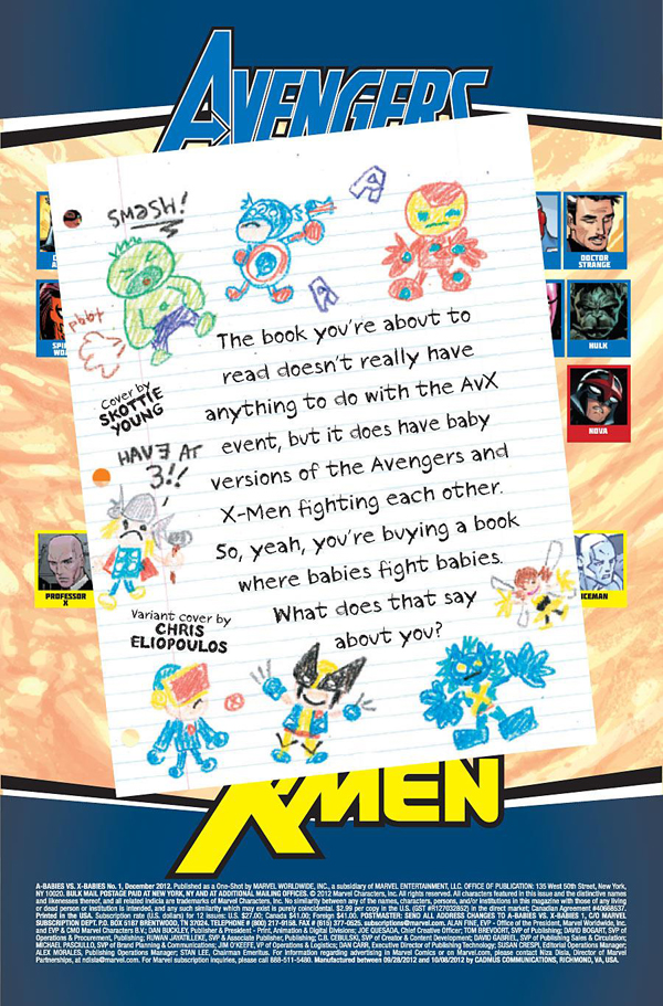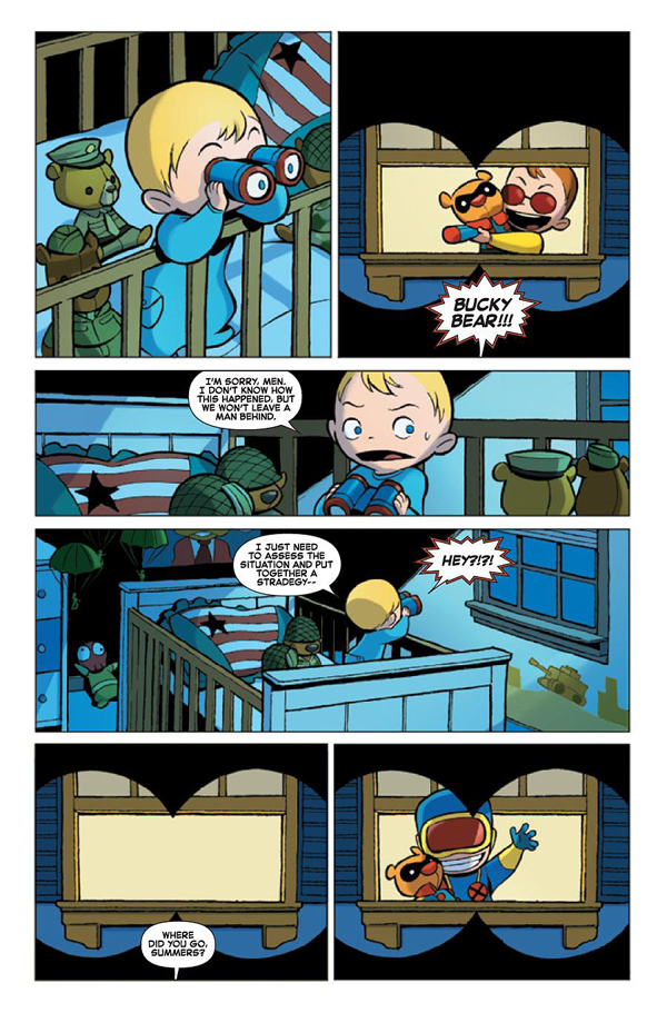 Con Young a los guiones y el dibujante Gurihiru, este one-shot nos contará lo que ocurre cuando Bebé Cíclope decide secuestrar al Osito Bucky de la seguridad del hogar del jovencísimo Steve Rogers. Además, "Fénix está llegando… y eso llevará a los bebés a una guerra sin cuartel. Descubriremos quién sobrevive, quién muere y cuántos sucumbirán a la dermatitis del pañal", en las simpáticas palabras del guionista.
