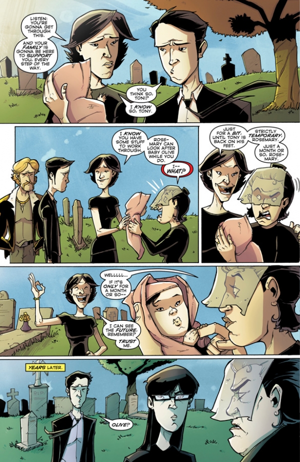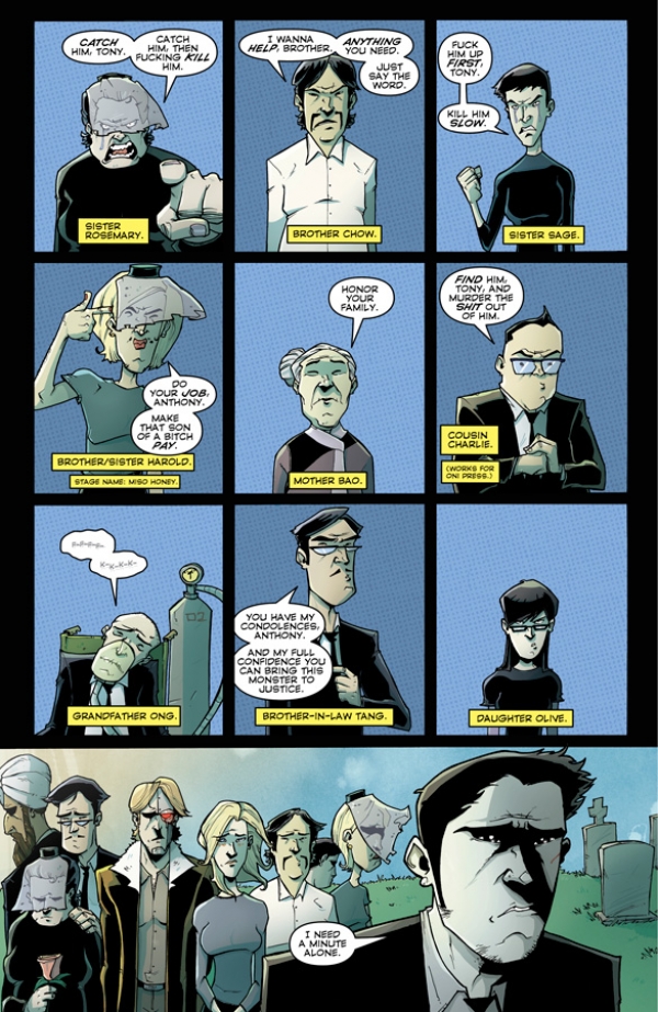Uno de los personajes principales sufría un terrible destino a manos del villano de la serie en las últimas páginas de Chew # 30, lo que sitúa la acción del siguiente número inmediatamente después, con nuestro protagonista rodeado de familiares y amigos, tratando de superar la irreparable pérdida.
