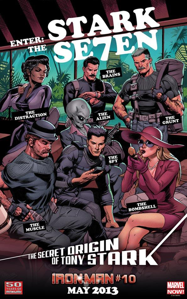 "Es la mayor historia que sacudirá la vida del hombre tras el traje de superhéroe", ha comentado Kieron Guillen, guionista de la colección tras su relanzamiento Marvel Now! "Este abril desvelaremos uno de los mayores secretos del pasado de Tony Stark en Iron Man #10 y empezaremos a visualizar quiénes son realmente los Siete de Stark y qué relación tienen con el vengador de Hierro."