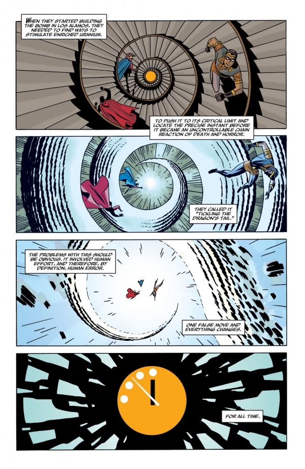 El planteamiento que hace Cooke de la obra es bien sencillo. Tras un primer número en el que presenta a estos “desconocidos” personajes empieza a rellenar algunos de los huecos que Moore dejaba en Watchmen. Mientras que Azzarello, en una de sus series, intentará arrojar luz sobre el asesinato de Kennedy y hasta qué punto El Comediante estaba implicado, Cooke nos narrará cuales fueron las causas tras la desaparición de Justicia Enmascarada.