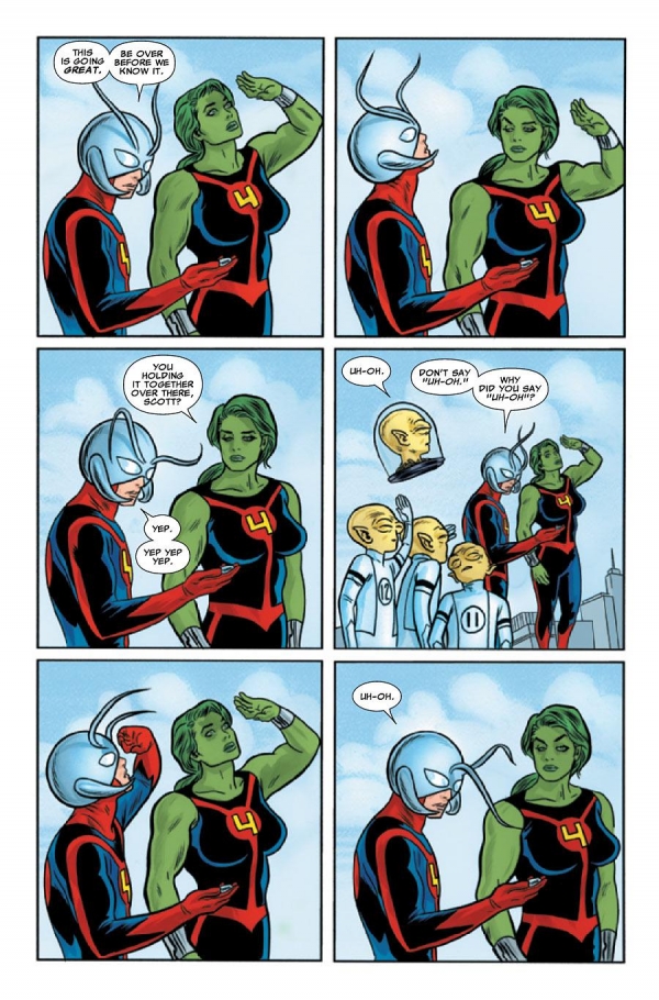 Buscando separarse, como es habitual, del sistema establecido, con la ironía y la fantasía como ideas constantes, Fraction y Allred plantean una historia “pop” que gira alrededor del cruce de egos de sus personajes, y las diferencias más que evidentes que existen entre todos. Pero tanto da que Scott Lang sea un héroe inseguro, Medusa una reina inhumana que oculta más secretos de los que debería, Hulka una abogada soltera buscando las segundas oportunidades o Darla Deering una estrella de la música en busca de su identidad.... los cuatro son ahora Los 4 Fantásticos (sustitutos), son los protagonistas y, lo quieran o no, todo depende de ellos. Por supuesto, el equipo creativo no se lo pone fácil para cumplir con esto. Para empezar, el choque de personalidades provoca mil y una discusiones, lo que es aprovechado por algunos de los villanos más míticos del grupo. ¿Alguien ha dicho Muerte? Por supuesto, pero ¿y si lo juntamos con otras dos némesis legendarias de Los 4 Fantásticos? La pregunta que queda mientras se van desarrollando estos argumentos es si nuestros inesperados héroes podrán con todo esto y con las, seguro, nuevas amenazas que van a ir surgiendo en el futuro cercano.