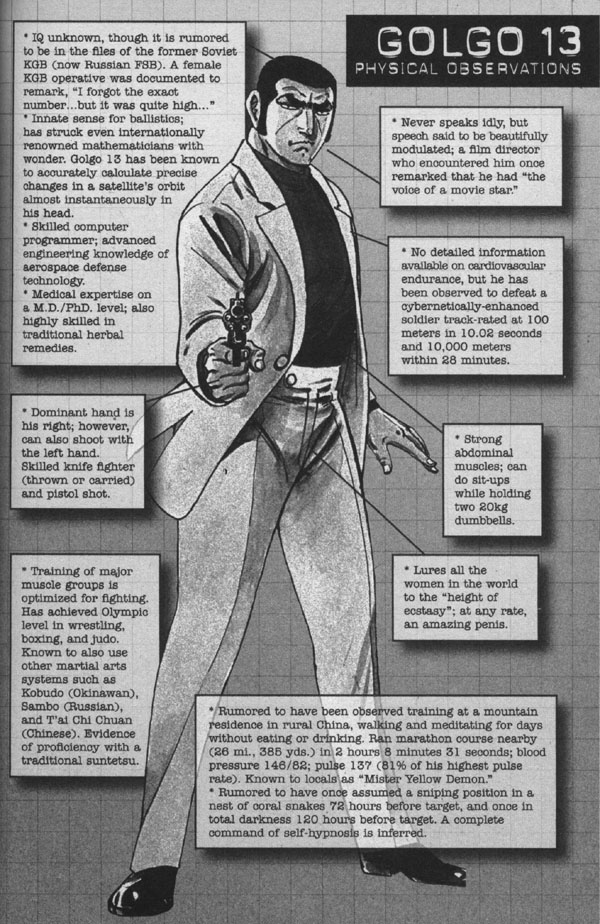 Golgo 13 es un manga para adultos que narra las peripecias de Duke Togo, un asesino profesional de fama mundial apodado Golgo 13. Inspirándose en el James Bond de Ian Fleming –varias de cuyas novelas el propio Saito había adaptado previamente en viñetas- el autor construyó un asesino frio, metódico y que nunca falla. Experto en combate cuerpo a cuerpo y todo tipo de armas, su favorita es un rifle M-16 modificado con mirilla telescópica, con el que es capaz de lograr disparos con una habilidad y precisión prácticamente sobrenaturales. Con el dinero como única motivación Golgo 13 ha trabajado para (y contra) patrones como la CIA, el KGB, la Interpol, sindicatos del crimen, gobiernos y toda clase de particulares.