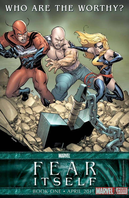 Por levantar el tercer martillo pugnan el Hombre Hormiga, el Hombre Absorbente y Carol Danvers.