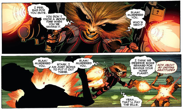 La versión socarrona que Bendis nos entrega de Mapache Cohete es, sin duda alguna, uno de los hallazgos del título |