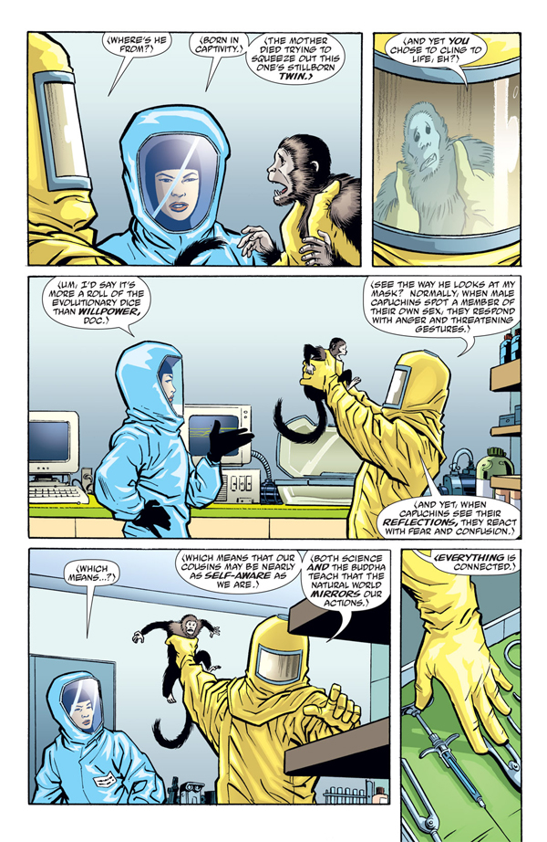 El leitmotiv de todos estos acontecimientos es la búsqueda, una vez más, de Beth, la perdida novia de Yorick en Australia. Las piezas de este gran puzle dispuesto por Vaughan van colocándose poco a poco, pero parece que aún tardaremos un tiempo en ver el reencuentro entre ambos a pesar de la insistencia del último hombre vivo. Para compensar, en paralelo a la trama principal, echamos la vista a los lados para conocer qué ha sido de Hero Brown. La hermana de Yorick continua su redención, encontrándose esta vez con otra vieja conocida de todos los lectores... y con los restos de la Iglesia católica, aún desesperados por encontrar al nuevo representante de Dios sobre la Tierra. Se trata de un número muy especial, cuyo original desenlace nos permite encariñarnos más con Yorick y con todos los que le rodean. Exactamente el mismo caso que con el ejemplar que cierra el volumen, centrado en el destino de la clave de todo este relato: el mono Ampersand
