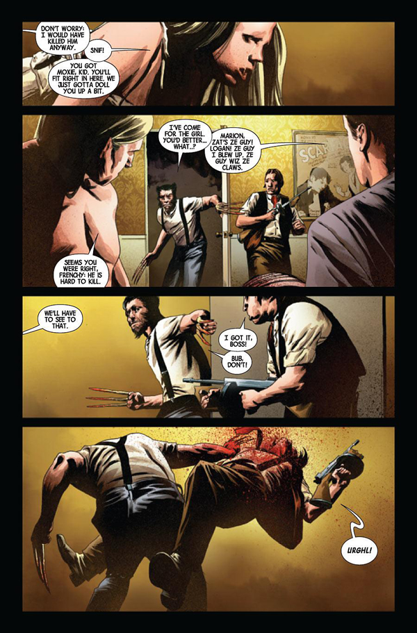 A partir de este argumento propio de las más conocidas series de género negro, Isanove desarrolla una historia que se queda a medio camino respecto a lo que hemos podido disfrutar en meses anteriores. Argumentalmente está mucho mejor construida que la historia de compromiso ecológico de Phil Jiménez, pero quizás le falta un poco más de la intensidad de la futurista trama de Jock. El gran punto a favor de Isanove es construir una atmosfera fantástica, “cocida a fuego lento”, con mucho cuidado en todos los detalles de la ambientación, en los fondos y espacios en los que se desarrolla la acción, así como en la vestimenta de todo el reparto. Especialmente cuidadoso ha sido hasta en los diálogos, haciendo alusión a acontecimientos del momento como la peculiar y nunca aclarada muerte del legendario escapista Harry Houdini. En el fondo, a pesar de todos estos detalles, se trata de la típica aventura en la que Lobezno se ve envuelto casi sin querer, una historia basada en el honor que tantas veces ha tenido que defender y la lealtad a sus aliados, pero que gana en originalidad por estar situada en este periodo vital del hombre-X gracias al buen hacer de un Isanove que encara con valentía su primer encargo como autor completo dentro de la Casa de las Ideas.