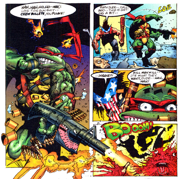 La otra cara de ese éxito es que, debido a su éxito empresarial, Eastman y Laird apenas podían dedicarse al cómic. A partir del #12 fueron delegando el dibujo primero y el guión después en jóvenes autores como los citados Lawson y Brown, Steve Murphy, Michel Dooney y Eric Talbot –con ocasionales colaboraciones de nombres consagrados como Dave Sim, Michael Zulli o Richard Corben-. Las historias fueron volviéndose más episódicas y el dibujo mucho más simple hasta la serie terminó en el #62 con una larga saga que cerraba buena parte de las tramas argumentales. En los años siguientes se sucedieron dos volúmenes más: el primero, publicado a todo color y a cargo de Jim Lawson, duró solamente trece números. El segundo, editado por Image, volvía al blanco y negro e incluía varios cambios argumentales (Raphael convertido en un villano, Leonardo con una mano amputada) que no fueron del agrado de los fans ni de los propios creadores. Su cierre, tras solo veintitrés números parecía certificar el declive de la “turtlemania” a mediados de los 90.