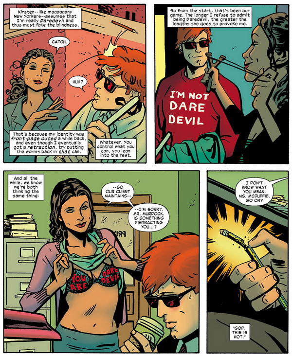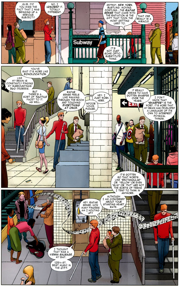 Sin dejar de lado aspectos ineludibles del personaje como las intrigas criminales y/o judiciales, los problemas para mantener el secreto de su doble vida o sus complicadas relaciones con las mujeres, Waid sale de la autarquía que la serie había venido construyéndose en los últimos años para irse de paseo por el universo Marvel. Donde antes estaban (casi) exclusivamente Kingpin, la Mano o María Tifoidea ahora aparecen personajes como Klaw, el Dr. Muerte y los Hijos de la Serpiente. Si el protagonista se cruzaba frecuentemente con Spiderman, Punisher y Luke Cage, ahora lo hace con el Hombre Hormiga, Estela Plateada o la Legión de los Monstruos con inesperados resultados. Si antes lo veíamos patrullando exclusivamente los tejados y callejones de Nueva York, ahora alterna con lugares tan distintos como el reino subterráneo del Hombre Topo, Latveria o los bosques de la América profunda. Y de paso se presenta un nuevo plantel de personajes, con villanos como Coyote e Ikari y un nuevo interés romántico en la fiscal Kirsten McDuffie.