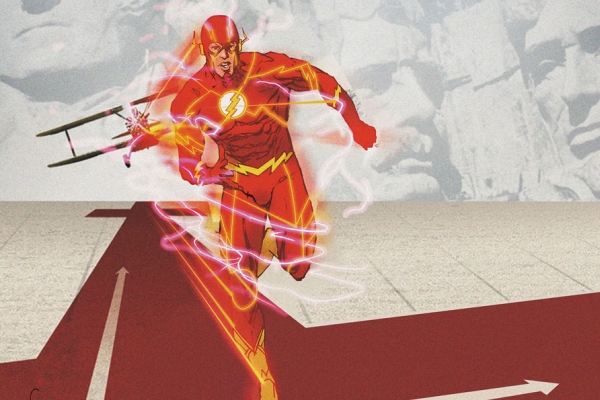 Ni siquiera Alfred Hitchcock se escapa de verse reinterpretado por los héroes de DC, y en este caso es Bill Sienkiewicz el encargado de que Barry Allen emule a Cary Grant intentando escapar en “Con la muerte en los talones”.