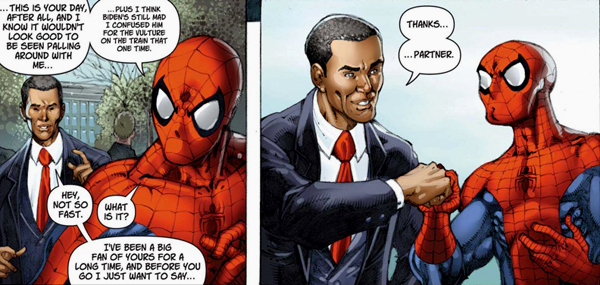Obama choca los puños con Spiderman igual que lo hacía con su mujer durante la campaña electoral.