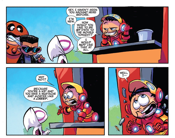 No encontramos en Marville, una ciudad que da cobijo a las versiones infantiles de los héroes y villanos Marvel. Por supuesto, las rivalidades imperantes en la realidad tradicional superheroica de la editorial están representadas en la calles de esta pintoresca urbe y mutantes y vengadores se enfrentan en todo momento por ser los más ‘molones’ del lugar. Ningún lugar es seguro en este enfrentamiento: las aulas, los puestos de comida ambulante, el recreo, los parques de juego y, por supuesto, los clubes secretos y exclusivos, construidos uno enfrente de otro con unos escasos metros entre ellos.