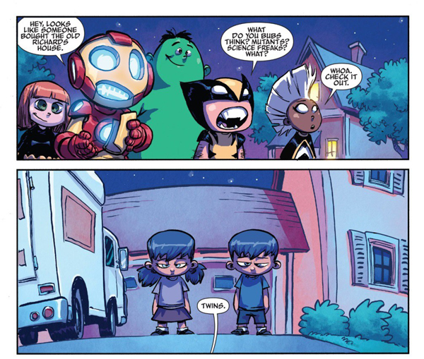 La llegada de una pareja de gemelos a la ciudad –todos sabemos perfectamente que tener a una pareja de gemelos en tu grupo mola mazo- disparará la rivalidad entre las dos facciones a niveles estratosféricos, llevando a ambas partes a sacar sus armas secretas para asegurarse la adición de los nuevos pequeños. Impagables son los respectivos tours que los grupos regalan a sus posibles fichajes con momentos tan divertidos y memorables como la Bola Especial de Coloso Jr., el descubrimiento de la pantalla HD de 400 pulgadas en 6D –un sistema en la que la “tele puede matarte y tal” en palabras de Cíclope-, las visitas a Asgard y al desértico gimnasio del Capi o el papel que juega Lobezno con sus divididas lealtades.