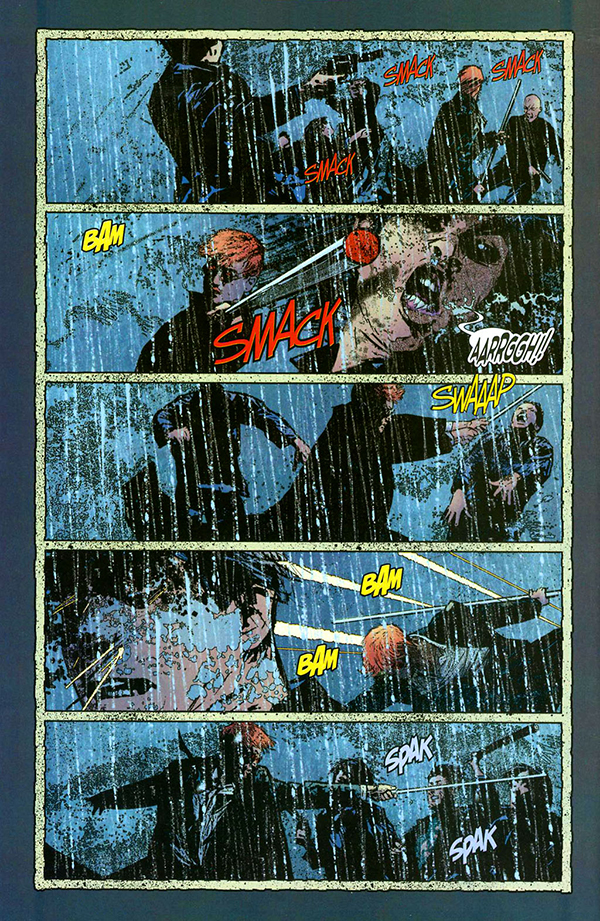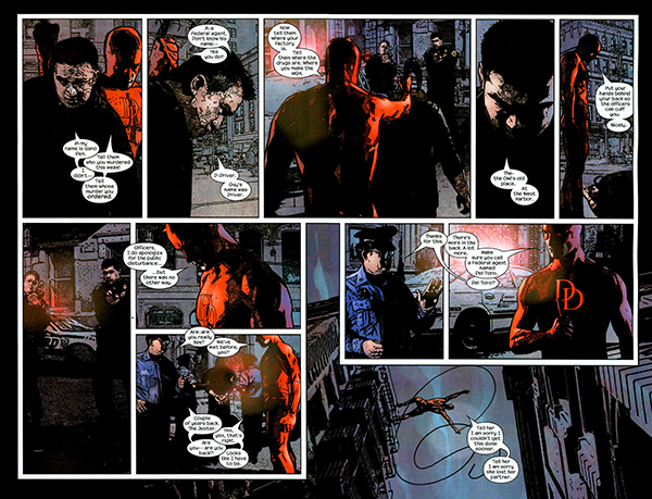 Con un excelente trabajo de caracterización de personajes tanto veteranos –Kingpin, Foggy Nelson, Ben Urich, María Tifoidea- como nuevos –Milla Donovan, la nueva Tigre Blanco- y ajenos –Luke Cage, Jessica Jones, Spiderman- esta larga etapa también deja espacio para interesantes interludios argumentales –la trama de espionaje relacionada con la Viuda Negra- y experimentos narrativos –el número mudo o el formado por una larga secuencia de lucha entre Daredevil y cien (literal) miembros de la Yakuza-. Pero sin duda uno de los puntos álgidos es su conclusión. Y es que Bendis y Maleev pondrían punto y final a su labor en el #81 USA con un inesperado desenlace que, en lugar de devolver al genio dentro de la botella, se atrevía a dejarlo en una situación aún más insólita y complicada que la que daba inicio a su etapa.