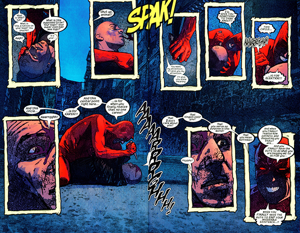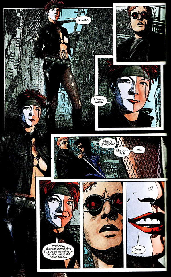 A finales de los noventa el relanzamiento de Daredevil dentro del sello Marvel Knights supuso el regreso del personaje a primera línea editorial. Terminaba así una larga época donde solamente Ann Nocenti parecía haber dotado de cierta personalidad a la serie del Diablo Guardián. El resto se habían limitado a copiar de forma rutinaria los tics de la influyente etapa de Frank Miller sin apenas rastro de la solidez e inventiva de la misma. Pero a pesar de la calidad de la nueva andadura esta carecía de cierta consistencia, caracterizándose por unos autores –Kevin Smith, David Mack, Brian Bendis, Bob Gale- que apenas se mantenían en la serie media docena de números. Todo cambió cuando el citado Bendis regresó con una premisa tan ambiciosa como atrevida bajo el brazo.