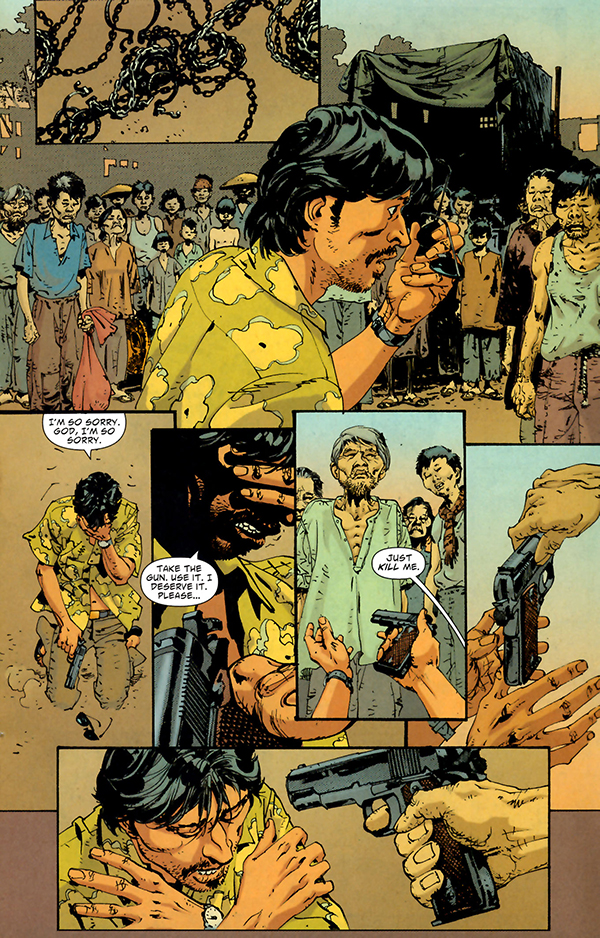 Sin embargo, debemos llegar a la mitad del tomo para encontrarnos con esa patada en el estómago que es No Deseado. Son muchos los momentos dignos de reseñar dentro de esta saga centrada en la relación entre padres e hijos, la decisión de uno de los personajes protagonistas sobre si debe abortar y la forma tan impresionante en que Aaron, y sobre todo Guéra, nos cuentan como Dash supera su adicción a las drogas, alucinaciones incluidas. Simplemente impresionante.
