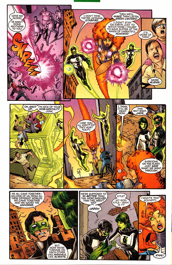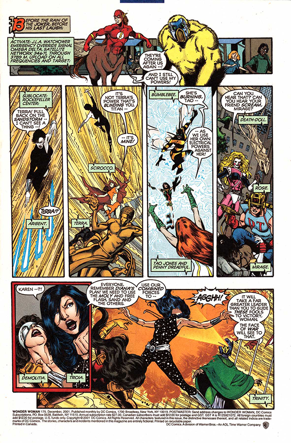 Después del enfrentamiento con la nueva Silver Swan que sirve para abrir el volumen y, al mismo tiempo, demostrar que Jiménez va a apostar por la acción desde la primera página, arranca la primera gran saga del tomo, directamente relacionada con Nuestros Mundos en Guerra, una de las interminables sagas que sacudían a la práctica totalidad de series de DC cada pocos meses y que, más que para crear expectación, servían para detener las tramas abiertas hasta la fecha, interrumpir las historias ideadas por los diversos equipos creativos y, en definitiva, forzar el encuentro entre personajes clásicos de la casa e intentar empujar un poco las ventas. Se nota que Jiménez es perro viejo en la casa y por eso decide utilizar el pretexto editorial de turno para dejarnos una gran historia que profundiza un poco más en la relación entre Wonder Woman y su madre Hipólita, aprovechando que esta última formaba parte de la JSA.
