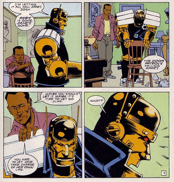 Y hablando de planificar de forma magistral, Morrison nos dejará un nuevo ejemplo, de esos que te dejan la boca abierta y te obliga a buscar el primer tomo de la etapa para revisarlo de cabo a rabo, y es que otra amenaza que ha estado oculta entre las sombras va a mostrarse al fin ante los ojos de Robotman, revelando a los atónitos lectores que ha guiado su destino incluso durante aquella ya famosa carrera de coches que terminó en el accidente que le dio su nueva forma. Un mazazo a los fans que están hastiados de tramas casi calcadas de una serie a otra que, de repente, se encuentran con un cómic que les desafía a pensar y a cuestionarse todo lo que creían conocer.