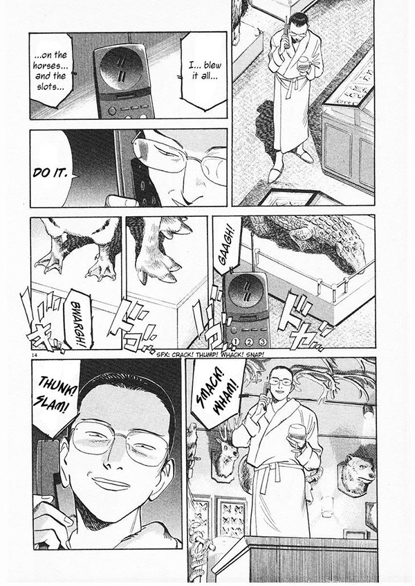 Por el camino hemos conocido ya a su amor de juventud, Keiichiro, a quien hemos visto probar suerte también en el tenis profesional y que ahora vivirá sus horas más bajas; por un lado, con un accidente que puede que le cueste abandonar para siempre las pistas de tenis y, por otro, porque todo parece indicar que ha sucumbido al fin a las románticas maquinaciones de Choko, que lleva bastante tiempo detrás del joven. Sin embargo, quien parece robar el protagonismo del tomo es Sakurada, el joven cobrador de deudas quien, encariñado con Miyuki y sus hermanos, le ha dejado pasar por alto en más de una ocasión algunas infracciones referentes al pago de la deuda y que ahora deberá hacer frente a un enfurecido Wanibuchi. Además, será él quien encuentre a Iyesu, el hermano de Miyuki que realmente debe el dinero, y será el causante de la herida de Keiichiro.