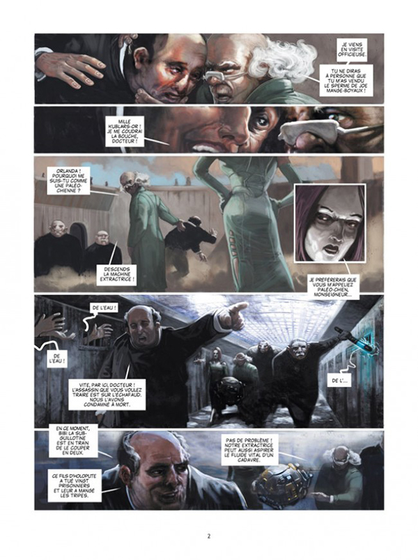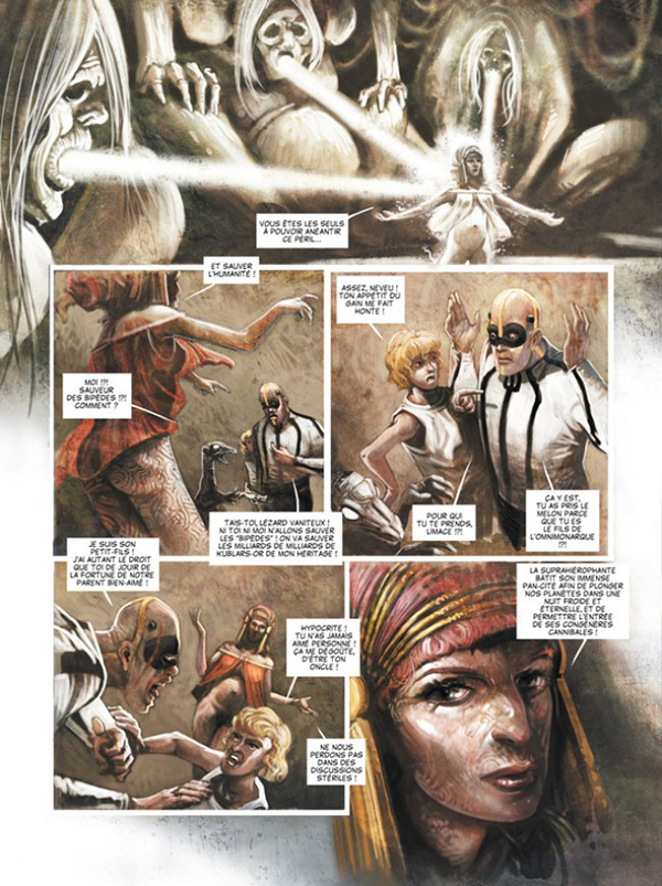 Del dibujo se encarga Nicolas Fructus y, de nuevo, el estilo y la forma de plasmar del artista no tienen nada que ver con sus equivalentes americanos, regalándonos unas splash pages sencillamente brillantes. El guión de Jodorowsky le da pie a mostrarnos escenas salvajes de casi cada una de las muertes que aparecen en el tomo. Una obra que no deja indiferente al lector y que, al menos para mí, ha abierto la puerta a una nueva concepción del cómic, de la que seguiré disfrutando con las nuevas propuestas que edite ECC.