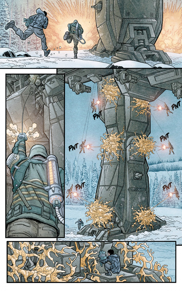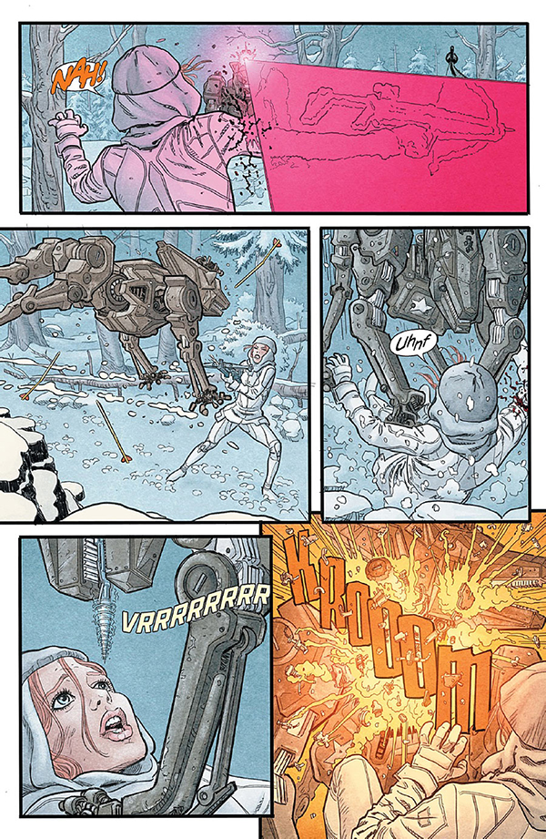 Nuestra protagonista es Amber, quien perdió a sus padres durante los primeros ataques americanos hace años y que ahora deambula por los bosques canadienses evitando caer en alguna de las trampas del ejército americano. Allí conoce al Escuadrón 2-4, la última esperanza de los canadienses, que se ha robotizado con gigantescos mecas que parecen salidos de Pacific Rim, para la batalla que resultará inevitable. Aunque no lo parezca con semejante argumento, se trata de una historia de personajes, en la que es más importante saber de dónde viene cada uno que conocer el destino que les aguarda al final del tomo. En un delicado balance, marca de la casa de su multipremiado guionista, se alternan las espectaculares escenas de acción con diálogos que rozan lo absurdo, como aquel en el que los protagonistas se preguntan por la verdadera nacionalidad de Superman o cuando algunos de ellos recuerdan los sacrificios que se han visto obligados a hacer desde que la guerra llegó a sus vidas. Vaughan no se corta en ningún momento para dejar claro su mensaje antibelicista y, por increíble que parezca, pone a los americanos como los malos de la película a pesar de ser estadounidense. Además, el relato incluye partes verdaderamente incómodas para el lector, como la tortura a la que es sometida una de las protagonistas y es que estamos ante una historia sobre la guerra, pero en ningún momento la justifica.