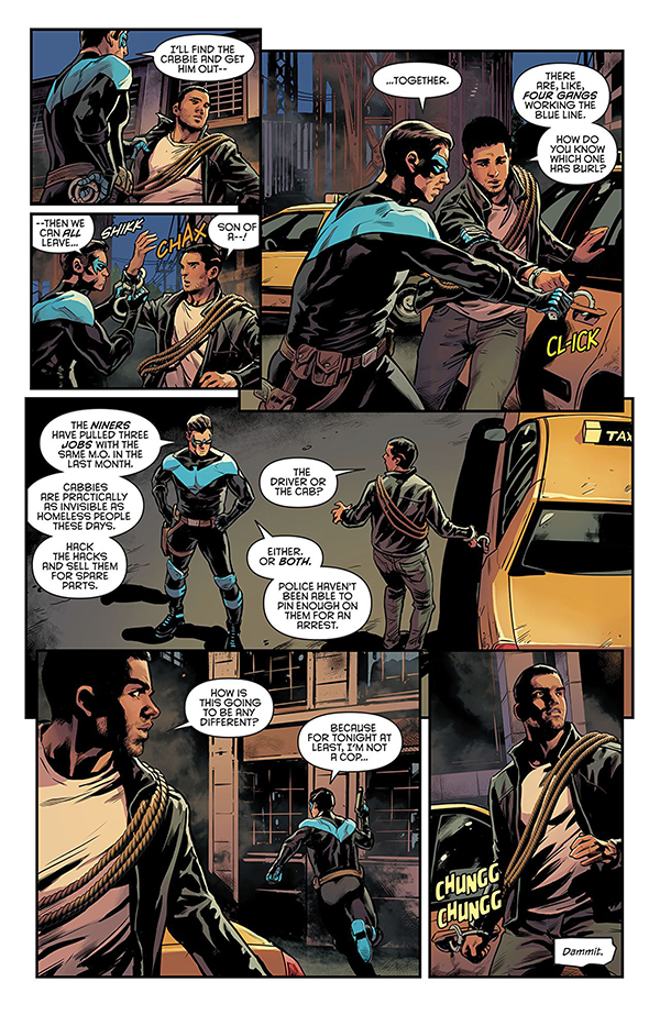 Todo esto se traducirá en un plantel de nuevos personajes que apoyen las nuevas tramas y situaciones de la recién estrenada etapa. El “truco” de la amnesia no es nuevo para el lector, así que van a exigir que los guionistas presenten algo novedoso y que les sorprenda. Tanto Lobdell como Nicieza saben lo que hacen, ambos tiran de veteranía y deciden enfocar la serie como una búsqueda personal por parte de Ric, entre tanta confusión provocada por la amnesia intentará encontrarse a sí mismo en un nuevo mundo, dejando a Nightwing de lado. Sin embargo, este abandono no será bien recibido por parte de algún que otro ciudadano, gente que formará una brigada justiciera compuesta por agentes de la ley y de cuerpos especiales. Parece que alguien debe vigilar las calles.