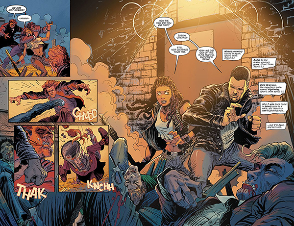 Este primer capítulo de la Temporada Primera cuenta con un título de lo más atrayente, Los Terrores del Caballero Oscuro y retoma la acción allí donde la dejó Seeley que deja al personaje en una situación altamente interesante para cualquier escritor. Recapitulando, la KGBestia disparó en la cabeza al bueno de Richard para hacer daño a Batman, una de las fases del maquiavélico plan urdido por Bane para romper la cordura del Hombre Murciélago. De esta manera, el chistoso compañero del defensor de Gotham perdería la memoria, siendo recordado tan solo por aquellos que lo conocían. Es hora de empezar una vida nueva lejos de Gotham y de la batfamilia como Ric Grayson, nuevo azote de Bludhaven.