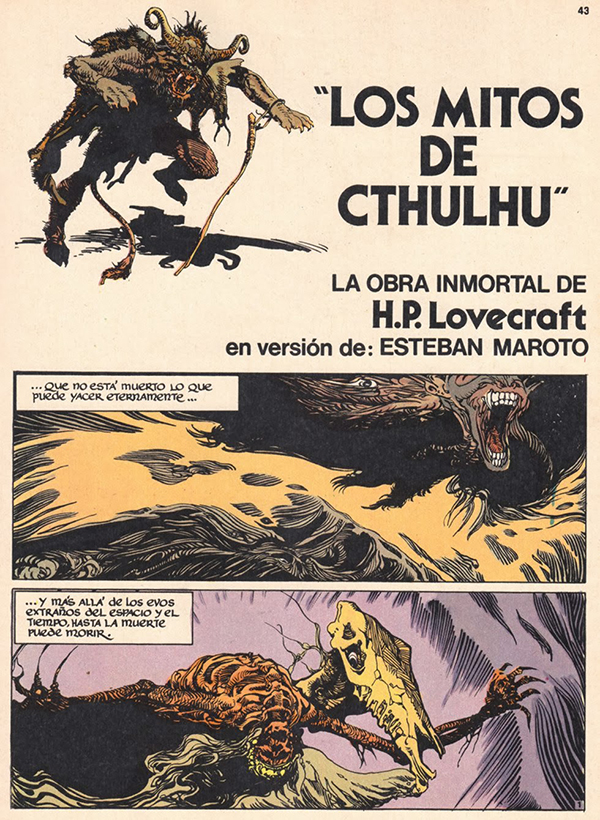 -Los Mitos de Cthulhu de Lovecraft (Planeta Cómic): poco antes de cerrar sus puertas a principios de los ochenta la emblemática editorial de cómic infantil Bruguera encargó a Esteban Maroto la adaptación de varias historias del autor de Providence. Solo tres (El Ceremonial, La Ciudad sin Nombre y La Llamada de Cthulhu) vieron la luz. Frente a las versiones de Breccia, Maroto impone una estética menos abstracta que se beneficia sin embargo de su estilo enjuto y cargado de detalles aunque, al igual que su predecesor, prefiere descargar el peso de la narración en forma de abundantes textos de apoyo. Su reedición décadas después eliminaría el funcional coloreado original en favor de un blanco y negro que permite apreciar la verdadera fuerza de los lápices del ilustrador español y su uso de las sombras para crear atmósferas.