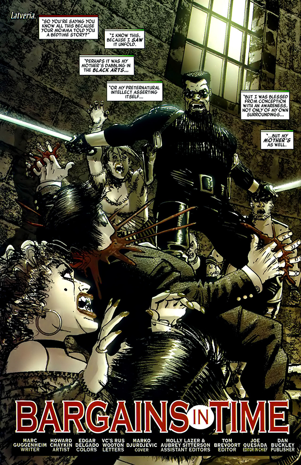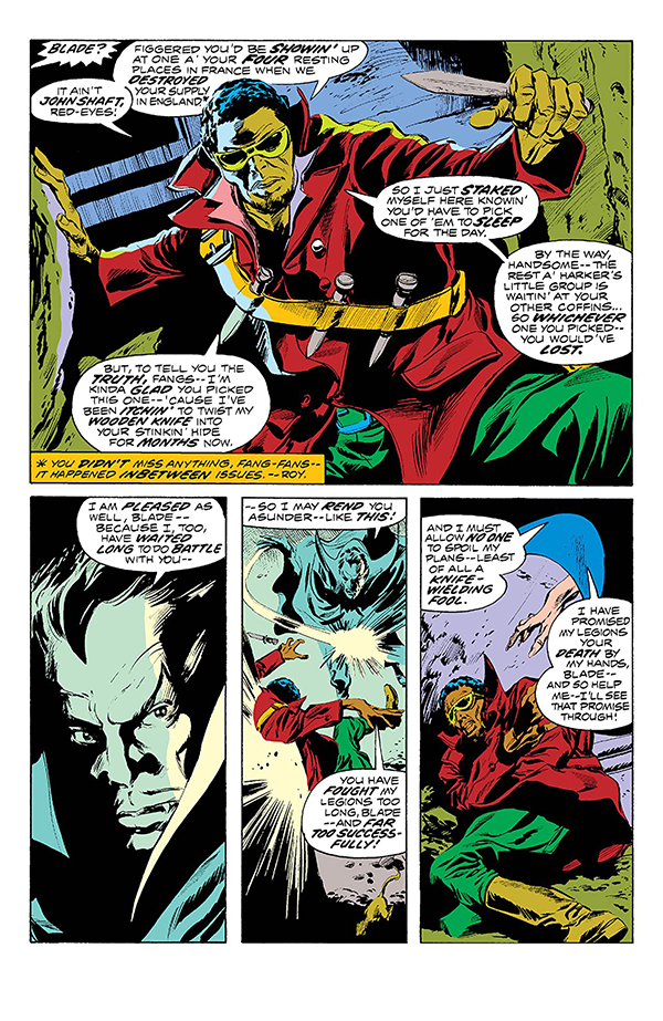 Creado en 1973 por Marv Wolfman y Gene Colan en las páginas de La Tumba de Drácula (#10 USA), Blade era un hijo poco disimulado de la blaxploitation, subgénero cinematográfico formado por películas de escaso presupuesto con protagonismo de personajes de raza negra en historias que combinaban la acción más comercial con un trasfondo de crítica social. El propio diseño original del personaje con su peinado afro y su cazadora de cuero no escondía su parecido con el actor Richard Roundtree, estrella del subgénero gracias a los film del detective John Shaft. Gracias a Wolfman, Blade se convirtió rápidamente en uno de los personajes favoritos de los lectores, eclipsando al resto de personajes que seguían el rastro del villano titular. Su carisma, personalidad ambigua y un arco argumental centrado en la búsqueda de venganza por la muerte de su madre a manos del escurridizo vampiro Deacon Frost propiciaron que llegase a protagonizar sus primeras aventuras en solitario en cabeceras antológicas como Vampire Tales y Marvel Preview, cuyas características editoriales –formato revista en blanco y negro- posibilitaban narrar historias de corte más explícito.