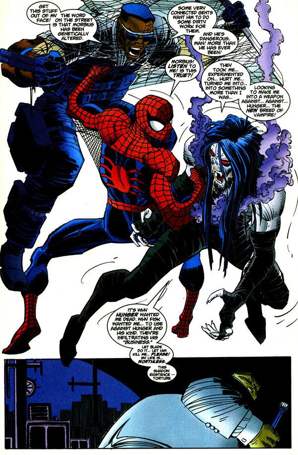 Una discrepancia que Marvel se encargó de corregir cuando Howard Mackie y John Romita Jr utilizaron al personaje como invitado en Peter Parker: Spiderman. Allí Blade era mordido por Morbius y, debido a la forma de vampirismo única de este último (de origen científico y no sobrenatural), Blade adquiría nuevas habilidades similares a las de su versión fílmica, con la que además comenzaba a compartir look y el apodo de “El caminante diurno” (sic). Dicha remodelación sería rápidamente aprovechada con Blade: Vampire Hunter, serie escrita e ilustrada por Bart Sears que intentó capitalizar el éxito del film con una trama similar, luciendo un dibujo de anatomía exagerada y colores digitales chillones propio de los excesos del género superheroico de los noventa. Acabó siendo cancelada tras solo seis números.