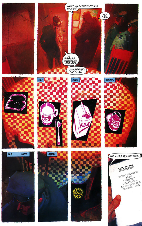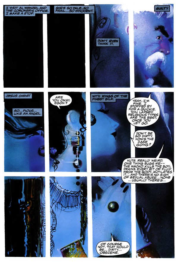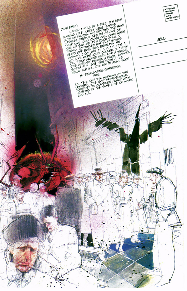 Pese a semejante mezcla de elementos dispares, que van desde el suspense policiaco al humor absurdo pasando por la violencia extrema y el surrealismo puro y duro, el Sienkiewicz guionista consigue que tan extraña combinación funcione sorprendentemente bien, presentando un retrato de personajes caracterizados por su patetismo y traumas. Personajes cuyas tramas se van alternando en paralelo con un ritmo eficaz, logrando que al final el argumento encaje como un todo único todas esas piezas que a priori parecían funcionar por su propia cuenta. Su lectura requiere sin embargo una gran dosis de suspensión de incredulidad y si bien en ocasiones el guión abusa de los textos de apoyo hasta el punto de saturar al lector, hay que reconocer que, pese a su bisoñez como guionista, el autor sabe cómo trabajar la personalidad de tan complicados personajes a través del texto.