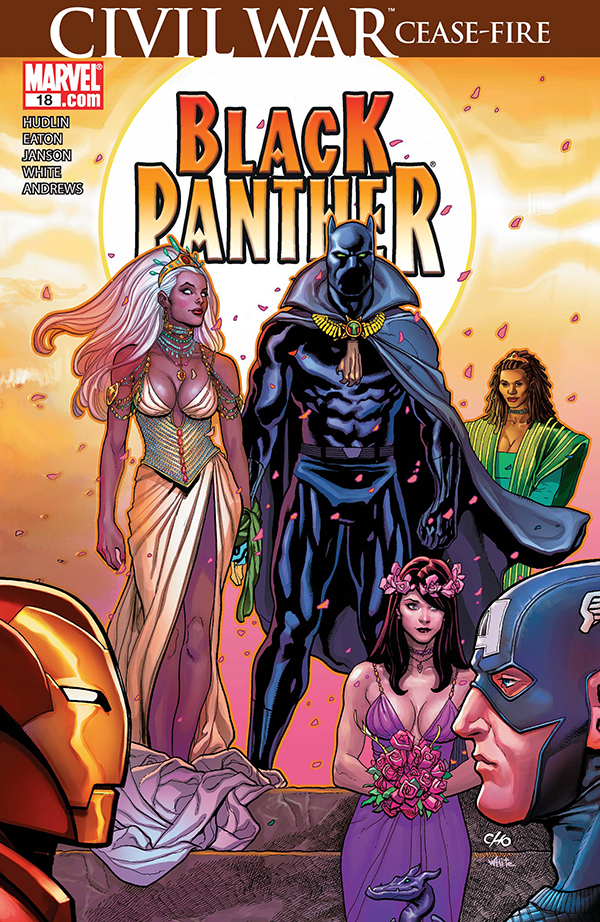 La siguiente saga (#10-13) dibujada por Scott Eaton fue planteada por Hudlin como un divertido homenaje al añejo cine blaxploitation, con T´Challa realizando un viaje por EE.UU. que le lleva a cruzarse con otros personajes de raza negra como Luke Cage, El Halcón, Blade, el Hermano Vudú, Mónica Rambeau o Shang-Chi (que es asiático, pero la “brucexplotation” es pariente no tan lejana de aquella) mientras pondera un futuro que le exige casarse para asentar su linaje como gobernante. Este último detalle supuso el siguiente punto de inflexión argumental, logrando gran repercusión mediática con La Novia de la Pantera (#14-18), arco centrado en la boda entre T´Challa y Tormenta, integrante de la Patrulla-X. Un romance que se había insinuado desde la ya lejana etapa de Chris Claremont y John Byrne pero nunca se había concretado por la separación entre diferentes líneas editoriales, cosa que Hudlin había preparado mediante un cruce previo con X-Men en los números #8-9. Una historia no exenta de humor referente a las vicisitudes de ambos pretendientes previas al compromiso que sirvió asimismo para expandir las costumbres y cultura de la imaginaria nación africana. Pero sobre todo resituó la importancia de Wakanda y su líder mediante la aparición de la plana mayor de un universo Marvel a las puertas de Civil War.