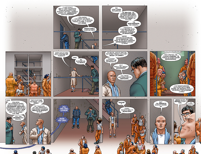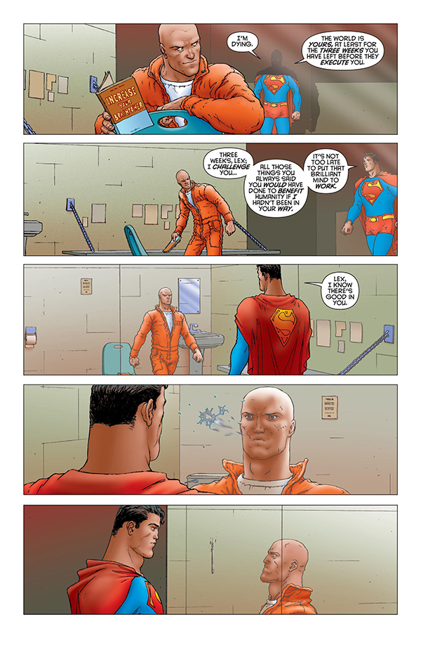 Una labor minuciosa a la hora de sintetizar la esencia del personaje a lo largo de toda su trayectoria que tiene su reflejo en los lápices de un Frank Quitely que trufa de detalles cada viñeta, empezando por la propia complexión musculosa e imponente de Superman y su contraste con el torpe y bonachón Clark Kent. Los diseños del planeta Bizarro, las imponentes salas de la Fortaleza de la Soledad y sus excéntricas galerías de recuerdos –que incluyen un reflotado Titanic (sic)-, el interior de la ciudad embotellada de Kandor, la caracterización de los miembros del Daily Planet, los diseños de los diferentes Supermanes de la corriente temporal… todo suma en una labor que alterna ilustraciones de gran impacto a toda página, como la que abre el primer número con Superman sobrevolando la superficie del Sol, con enrevesadas planificaciones de pagina como el paseo de Luthor por la cárcel con las viñetas organizadas en torno a una escalera central, convirtiendo el resultado en una pieza de orfebrería de la que se extraen nuevos detalles con cada relectura.
