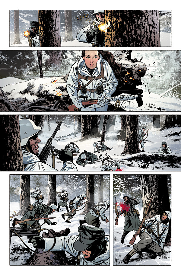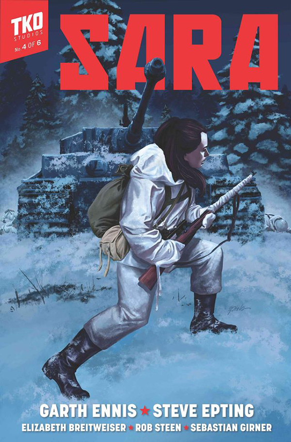 En el caso de Sara, Ennis regresa a la IIª Guerra Mundial para mostrarnos una faceta poco visitada dentro del imaginario de ficción de dicho conflicto: el papel de las mujeres soldado dentro del ejército soviético y, más en concreto, su sección de francotiradoras femeninas. Un activo militar responsable de numerosas bajas entre el ejército nazi durante la llamada “gran guerra patriótica” y crucial en la resistencia del frente oriental de la contienda pero cuyo papel fue mayoritariamente ignorado, siendo solo en los últimos años cuando ha comenzado a ponerse de relieve. Ambientada en el crudo invierno de 1942, Sara sigue a lo largo de sus seis entregas las peripecias de su protagonista titular, una joven tiradora de larga distancia cuya pericia a la hora de planificar y ejecutar sus operaciones la convierten en la miembro más destacada de su pelotón integrado exclusivamente por mujeres. Dicha pericia da origen a una celebridad tanto entre sus propias filas como entre las del enemigo, que la conocen con el apodo de La Zorra Roja (sic). Algo que, irónicamente para una francotiradora, acaba convirtiéndola en un blanco tanto de la maquinaria de propaganda soviética como de los esfuerzos de los nazis, quienes destinan a la zona a un misterioso francotirador de élite con el objetivo de liquidarla.