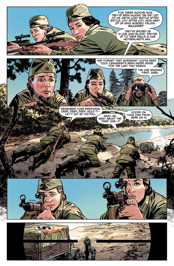 Ennis elabora un relato cargado de tensión donde la planificación, la espera y la sangre fría a la hora de tomar decisiones mortales en un solo instante marcan el ritmo de la narración, manejando con gran habilidad los saltos temporales que ponen en perspectiva las acciones de la protagonista con su visión del conflicto. Algo que se traduce en momentos tan destacados como el que forma el segundo capítulo, donde se muestra en paralelo sus reticencias apretar el gatillo durante su entrenamiento como francotiradora en contraste con su mortal eficacia posterior a la hora de liquidar en solitario a todo un pelotón enemigo. Una estructura que junto al certero uso de textos de apoyo en primera persona permite ir más allá del simple espectáculo de acción para profundizar en la personalidad de Sara, cuyo idealismo inicial ha dado paso a un cinismo descreído que apunta no solo a sus enemigos sino también a la hipocresía de su propio bando, responsable de sus propias atrocidades y siempre vigilante a la hora de purgar hasta el más simple gesto de disensión y/o crítica.