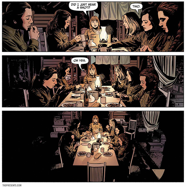 Sin recurrir a efectismos y esquivando los tópicos más sobados, Sara supone un relato de corte íntimo donde, más allá de la incertidumbre que supone ese duelo frente al fantasmagórico francotirador alemán, uno se queda con la evolución emocional de su protagonista y los lazos que establece con sus compañeras, enfocando la guerra no como una lucha por el poder entre potencias, sino entre seres humanos por defender a las personas que tienen a su lado. El emotivo desenlace, que resalta la humanidad del personaje en tan inhumano escenario, redondea el estupendo balance de uno de los cómics más redondos que servidor ha podido catar esta temporada. Un título que pone las expectativas bastante altas respecto a futuros lanzamientos de TKO, pero sobre todo demuestra que incluso en un género aparentemente trillado como el de las historias bélicas aún quedan filones sin explotar.