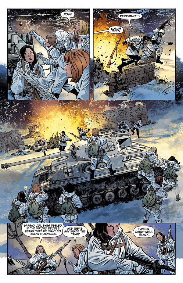Todo ese apego de Ennis por la verosimilitud y fidelidad del relato tiene su correspondencia en la parte gráfica por parte de Steve Epting. Un artista que desde su eclosión en la estupenda etapa del Capitán América junto a Ed Brubaker ha ido dejando de lado sus primeras obras como eficaz émulo de John Buscema para evolucionar en un estilo realista, rayano en lo fotográfico pero sin caer en el estatismo y/o la inexpresividad de otros autores que han adaptado esa pátina gráfica. La atención al detalle en las armas y uniformes así como la plasmación de los inmensos y solitarios parajes de las estepas rusas, redondeados por matices del color (la sombra de los arboles, las estancias iluminadas por un candil, ese blanco impoluto que transmite el frío de la nieve) obra de Elizabeth Breitweiser, proporcionan un aire cinematográfico -como de fotografía “gastada”- que certifican un producto de acabado impecable.