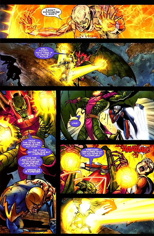 El inesperado éxito del evento dio sus frutos en forma de una nueva serie regular para Nova que asimismo servía de prólogo a una secuela. Pese al éxito cosechado Giffen decidió dar aquí un paso atrás y dejar la responsabilidad principal de la misma en el dúo Abnett y Lanning. Esta pareja de veteranos guionistas británicos, firmantes de la citada serie de Nova, se convertían en los autores de Aniquilación: Conquista, evento de 2007 que pese a partir de su predecesora y compartir idéntica planificación editorial pretendía (y lograba) dar una novedosa vuelta de tuerca tanto al argumento como a los protagonistas. Así, seis meses después de la oleada invasora, los supervivientes habían forjado una alianza para intentar reconstruir sus diferentes mundos. Una situación delicada que era aprovechada por la Falange (la raza de seres tecnorgánicos presentada por Chris Claremont y Bill Sienkiewicz en Los Nuevos Mutantes) para invadir y asimilar todos los mundos a su alrededor aprovechándose tanto de la menguada resistencia enemiga como de la desconfianza mutua entre los diferentes aliados.