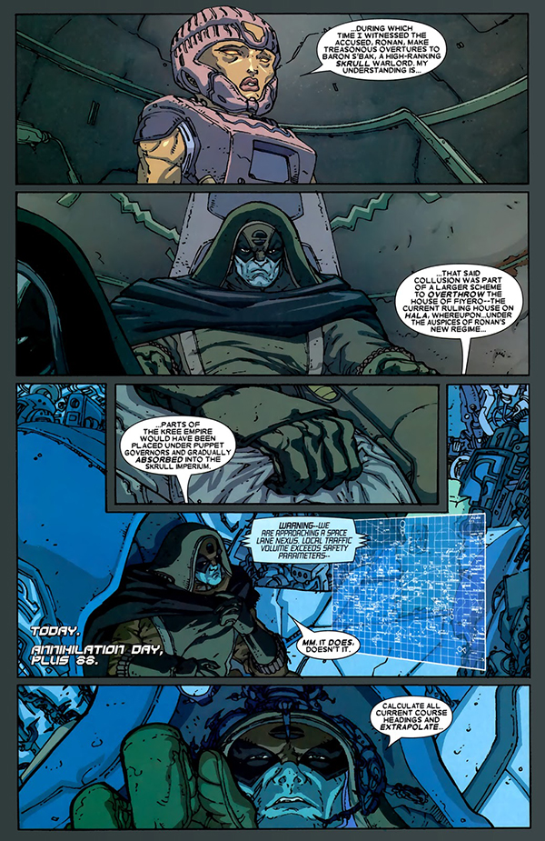 Partiendo de ahí se desarrollaban diferentes líneas argumentales a cargo de personajes como Nova, Quasar (cuyo manto había pasado a manos de Phyla-Vell, hija del Capitán Marvel original), Starlord (injustamente culpado del ataque y obligado a liderar una misión suicida para redimirse) y un personaje de nueva creación bautizado como Fantasma. Historias firmadas por autores como Christos Gage, Giffen, Grillo-Marxuach y los propios Abnett y Lanning, escribiendo también estos últimos de la miniserie principal dibujada por Tom Raney. La misma ofrecía de nuevo una trama rebosante de acción y giros inesperados, siendo el mayor de todos el papel de Ultrón, el mecánico villano de Los Vengadores convertido aquí en inesperado nuevo líder de la Falange y su plan para asimilar toda la vida orgánica de la galaxia. Asimismo se recuperaba a más personajes olvidados y en desuso como Mantis, Bicho (de los Micronautas), Mapache Cohete, Groot o un resucitado Adam Warlock, otra de las creaciones de Starlin y personaje clave en la resolución de la trama.