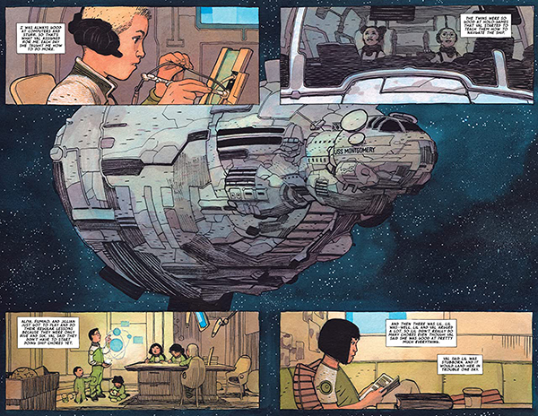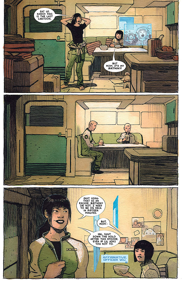 A medida que Lemire avanza con la trama de la obra, también los hacen las personalidades de los niños protagonistas, desde su líder, que lejos de tener las cualidades necesarias, se trata tan sólo de la mayor en edad del grupo; hasta el hijo de la causante del ataque que les ha dejado huérfanos. Los niños se verán formados por la situación a madurar a pasos agigantados, asumiendo cada uno una función dentro de la nave, y manteniéndose unidos para hacer frente a los problemas que van a ir surgiendo. La propia Val, el personaje central de la obra, evolucionará también dentro de su programación original, algo que ha debido suponer un reto para el guionista, al tener que mantener el lenguaje de una máquina a la hora de interactuar con el resto de personajes. También destaca el dibujo de Walta, que recrea sin esfuerzo los inertes espacios de la nave, la fragilidad de los niños que ahora se ven indefensos, o la propia inmensidad del espacio, que actúa como en el caso de la U.S.S. Montgomery, como otro personaje más de la historia.