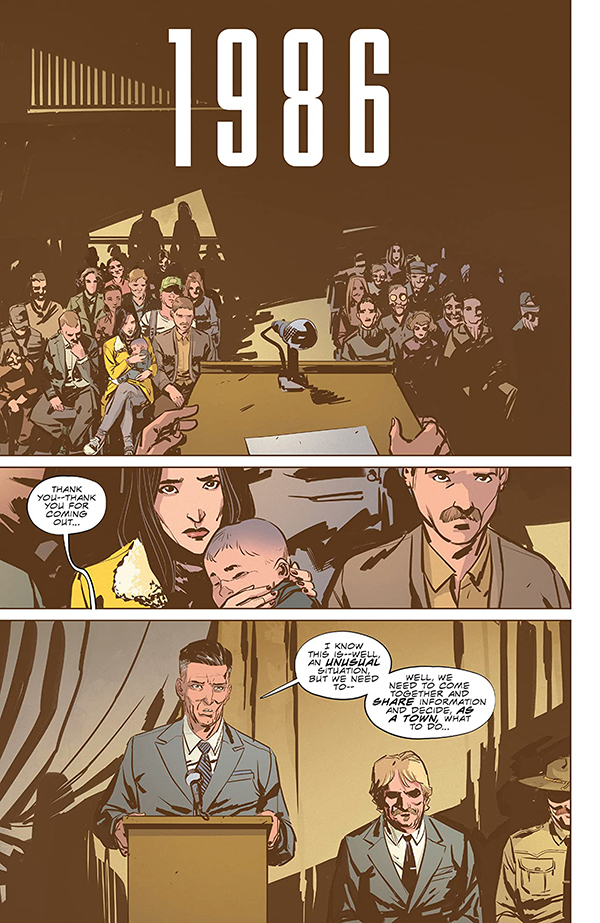 Stillwater, la serie de Skybound que ahora nos trae ECC en un tiempo récord teniendo en cuenta sus fechas de salida en Estados Unidos, consigue aunar todo lo anteriormente mencionado, presentando una trama atrayente como pocas y consiguiendo al final del primer tomo, que quedemos atrapados con los entresijos de este peculiar pueblo americano, a pesar de que las tramas han comenzado a fluir en sus páginas. Como digo, partimos de una premisa sencilla pero atrayente: en Stillwater nadie puede morir. Casi como si el tiempo se hubiera detenido, las heridas se curan, los huesos vuelven a soldarse y los años no pasan por sus habitantes, que han organizado sus vidas de forma casi clandestina frente al exterior y son gobernados por una suerte de magistrado todopoderoso, que controla sus destinos hasta el más mínimo detalle. Un vistazo a lo que en principio sería una bendición casi divina nos deja a unos niños que crecen mentalmente año tras año, pero siguen atrapados en sus cuerpos originales, y nos plantea una nueva perspectiva, que se trate más de una maldición que de un lujo disfrutable por la buena gente de Stillwater.