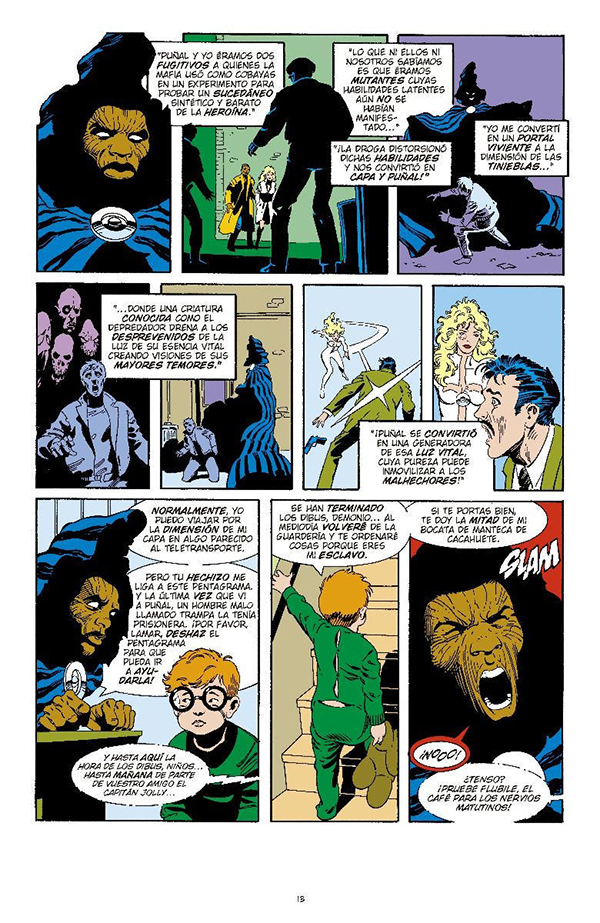 La epopeya editorial que han vivido desde su creación serviría para una nueva cabecera de Capa y Puñal. Nacidos en los años 80 utilizando el creciente tráfico de drogas existente en los Estados Unidos en esa década, Bill Mantlo crea a los dos torturados héroes como el lado oscuro o la consecuencia final de dejarse llevar por este mundo de drogas y perdición. Las primeras aventuras del dúo tienen mucho en común con Spiderman, y no me refiero solo a las continuas apariciones del trepamuros durante las primeras entregas de la serie, sino por el carácter urbano que desprenden sus páginas, en las que pandilleros y camellos se alternan en callejones que rezuman humo y peligro a partes iguales. Mientras que Spiderman se daba un baño de realidad descendiendo a la parte de Nueva York que no se mostraba en su serie regular, Capa y Puñal hacían lo propio, alzándose en este caso de las sombras entre las que siempre se movían para abrazar aquí su lado más superheróico y espectacular.