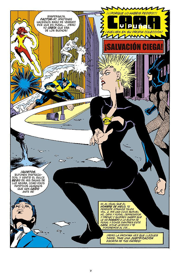 Llegamos así a los números contenidos en este volumen, cuarto si las cuentas no me fallan de esta recuperación de los personajes que está llevando a cabo Panini, para delicia de los fans más nostálgicos. La nueva cabecera llevaría por título Las Desventuras Mutantes de Capa y Puñal y pondría toda la carne en el asador ya en la primera entrega, dejando a Tyrone ciego, algo que Terry Austin, ahora como guionista, aprovecharía para darnos una visión de lo que significa ser ciego en una gran ciudad, las barreras físicas y emocionales a las que se enfrentan y, en definitiva, cargar las tintas en la parte social de la serie, que había sido abandonada en las ultimas etapas en favor de lo sobrenatural.