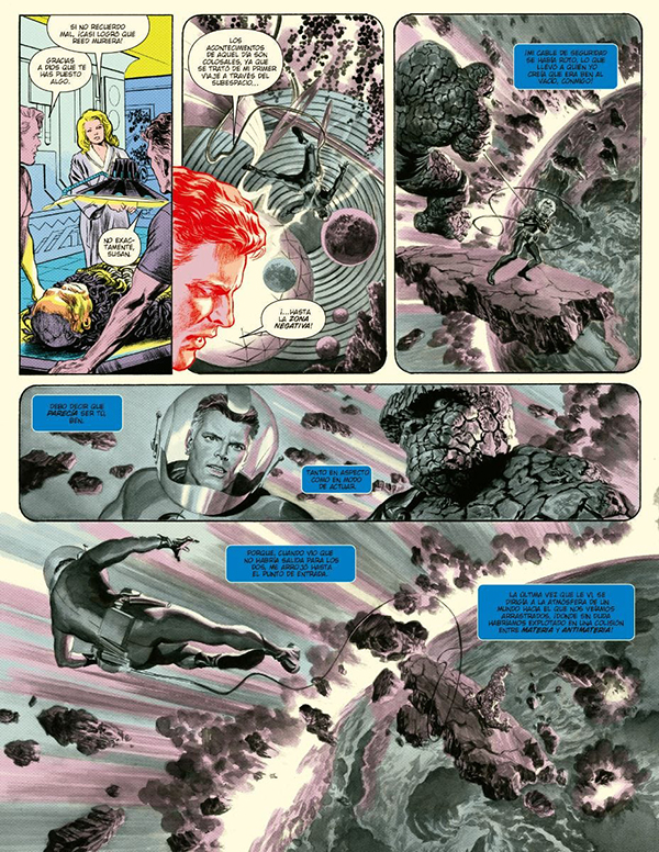 Resulta complicado establecer una fecha para esta nueva aventura, ya que el estilo que Ross da a los personajes, muy heredero del de Jack Kirby, al que homenajea sin reparos en cada viñeta sugeriría que estamos en los años 70, pero la posterior aparición de los hijos de Sue y Reed al final del tomo parecen indicar que estamos a primeros de los 2000. Este pequeño detalle, uno de tantos divertimentos que el autor parece esconder entre las páginas de esta novela gráfica, no debe para nada entorpecer la lectura de esta verdadera obra maestra que ahora nos llega. Ross utiliza la llegada del extraño ser para, estreno de nuevos uniformes de por medio, devolverles lo antes posible a la Zona Negativa, en la que nos encontramos con viejos conocidos, y con más de una sorpresa. Debo reconocer que nunca he visto a nadie plasmar con tanta imaginación este concurrido rincón del Universo Marvel. La Zona Negativa de Alex Ross es un cuadro abstracto en el que todo es posible, ilustrado con maestría por el dibujante, que mediante un psicodélico uso del color consigue un efecto irrepetible. El proyecto, que inaugura la línea Marvel Arts, está publicado en tapa dura y gran formato, ideal para perderse entre sus páginas, y acompañar al cuarteto en esta nueva y alucinante aventura. Una maravilla firmada por Alex Ross que nadie debería perderse, y que hace un justo homenaje a Lee y Kirby, culpables de que conociéramos la Zona Negativa y nos volviéramos adictos a sus aventuras. Esperemos que pronto lleguen nuevos proyectos Marvel Arts, aunque quizás Ross haya puesto el listón demasiado alto.