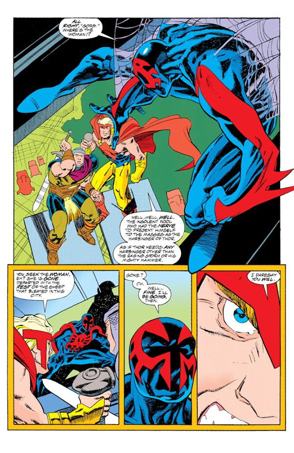 El crossover citado en el párrafo inicial es, sin duda, la joya de este volumen. En un futuro dominado por corporaciones, donde la religión ha perdido su influencia, la leyenda de Thor y los asgardianos resurge como esperanza para una sociedad decadente. La corporación Alchemax aprovecha este fervor para crear su propio panteón de dioses, utilizando figuras como Heimdall, Balder, Hela y Loki para consolidar su poder y eliminar cualquier amenaza al statu quo. Nuestro protagonista, junto con otros héroes emblemáticos de la línea 2099 como Muerte, Punisher, Ravage o los mutantes, deberán unir fuerzas para enfrentarse a esta nueva y peligrosa deidad corporativa.