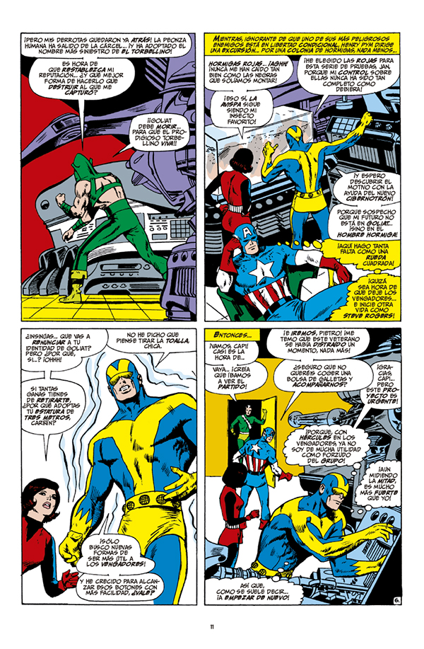 Sin embargo, el cambio que más dio que hablar fue el de Mercurio y La Bruja Escarlata, que recordemos habíamos visto como villanos en las páginas de La Patrulla-X, y que tras romper lazos con Magneto, decidían ponerse al otro lado, y formar parte de las filas de Los Vengadores. Para los amantes de las alineaciones, la que el grupo ofrece en estos números incluye, además de los dos mutantes reformados, al Capitán América, Goliat, Hércules, Ojo de Halcón y La Avispa. Como suele ser cada vez más habitual, la serie recibiría la visita de otros personajes como Thor o Iron Man, que seguían dando cohesión al que íbamos a conocer como “Universo Marvel” en las próximas décadas.