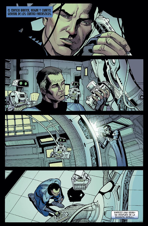 Abrimos el fuego con Reed Richards, y para la ocasión se ha hecho una elección muy efectiva. El tomo recopila íntegramente la miniserie que, con motivo de la saga Dark Reign, llegaba a las librerías dedicada al grupo de héroes, y aunque sea Reed quien toma el protagonismo, todos los miembros del grupo aparecen en estas páginas. Lo que hace especial a esta historia es el guionista que la firmaba, Jonathan Hickman, ya que podemos considerarla un anticipo a su posterior etapa en la serie, más que recomendable. Ayudado por el dibujo de Sean Chen, Hickman aprovecha un momento oscuro en el que Norman Osborn toma el poder, para explicarnos como nuestro protagonista trata por todos los medios de revertir los últimos hechos, para lo que ha construido El Puente, que le permite contactar con los Reed de otras realidades, un hecho que tendrá muchas repercusiones en el futuro, y tras el que va a poner en marcha un intrincado plan que le permita “resolverlo todo”.