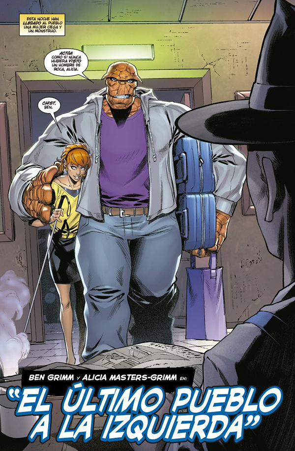 En este caso, nos encontramos con un grupo que se ha disuelto, por motivos que aún no han quedado claros para el lector, lo que va a dar lugar a historias independientes por parte de cada uno de sus integrantes. Así, La Cosa y Alicia Masters van a protagonizar el primer número de nueva etapa; el matrimonio formado por Reed y Susan el siguiente; y luego llegará el turno de Johnny Storm. El tono seguido por North también me ha atrapado desde el comienzo, con relatos que parecen sacados de un serial fantástico de los años setenta, como el conflicto temporal que atrapa a la adorable Cosa de ojos azules al comienzo de la nueva serie, o la realidad que se esconde detrás del idílico pueblo que visitan Reed y Sue van a visitar.